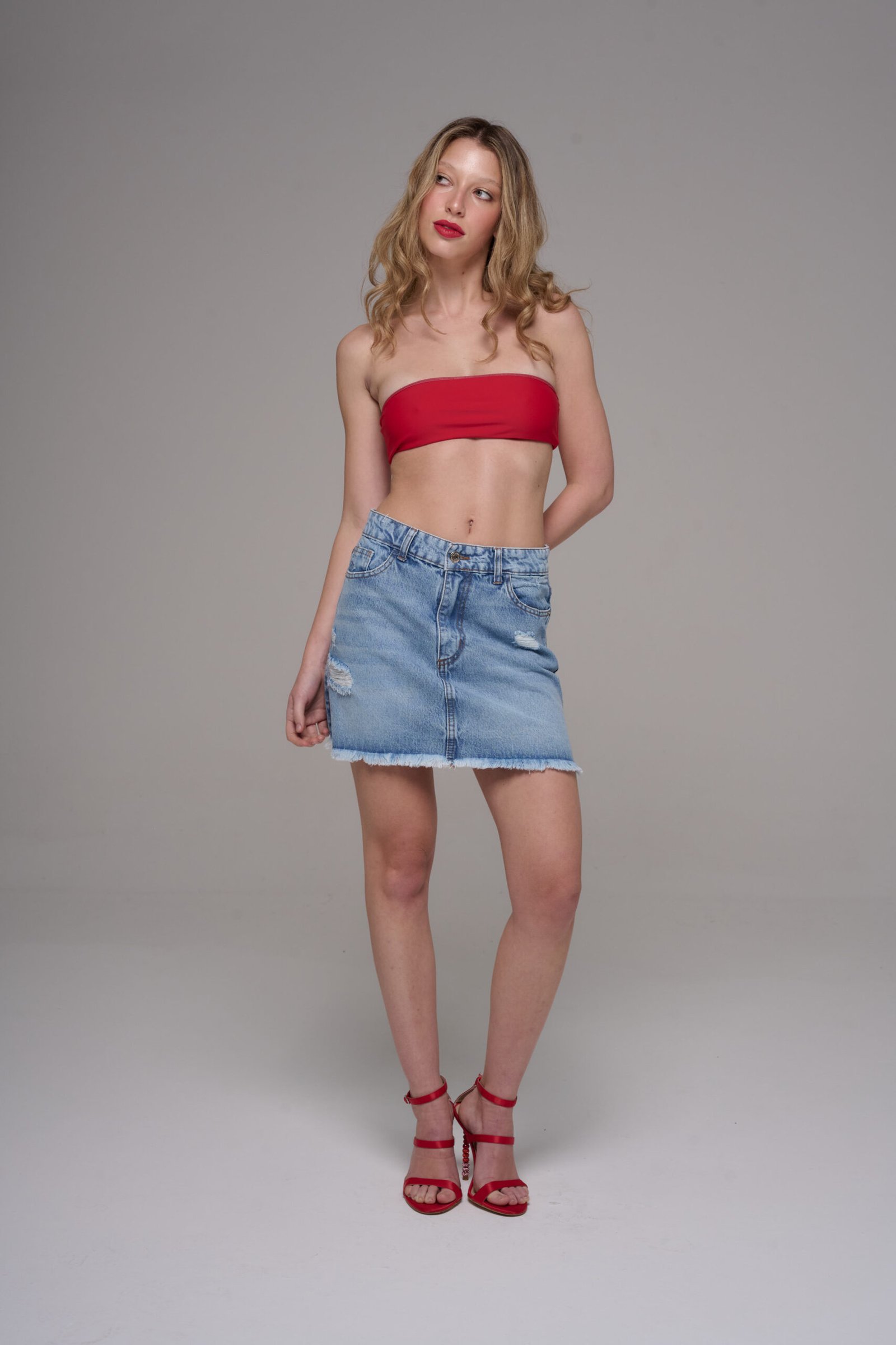 Mini tiro medio. Denim rigido, color light blue con localizado suave y ruedo desflecado con rutras. Confeccionado en denim 100% algodón. Si bien el material es resistente y el armado minucioso, estas prendas son delicadas y requieren un cuidado especial.